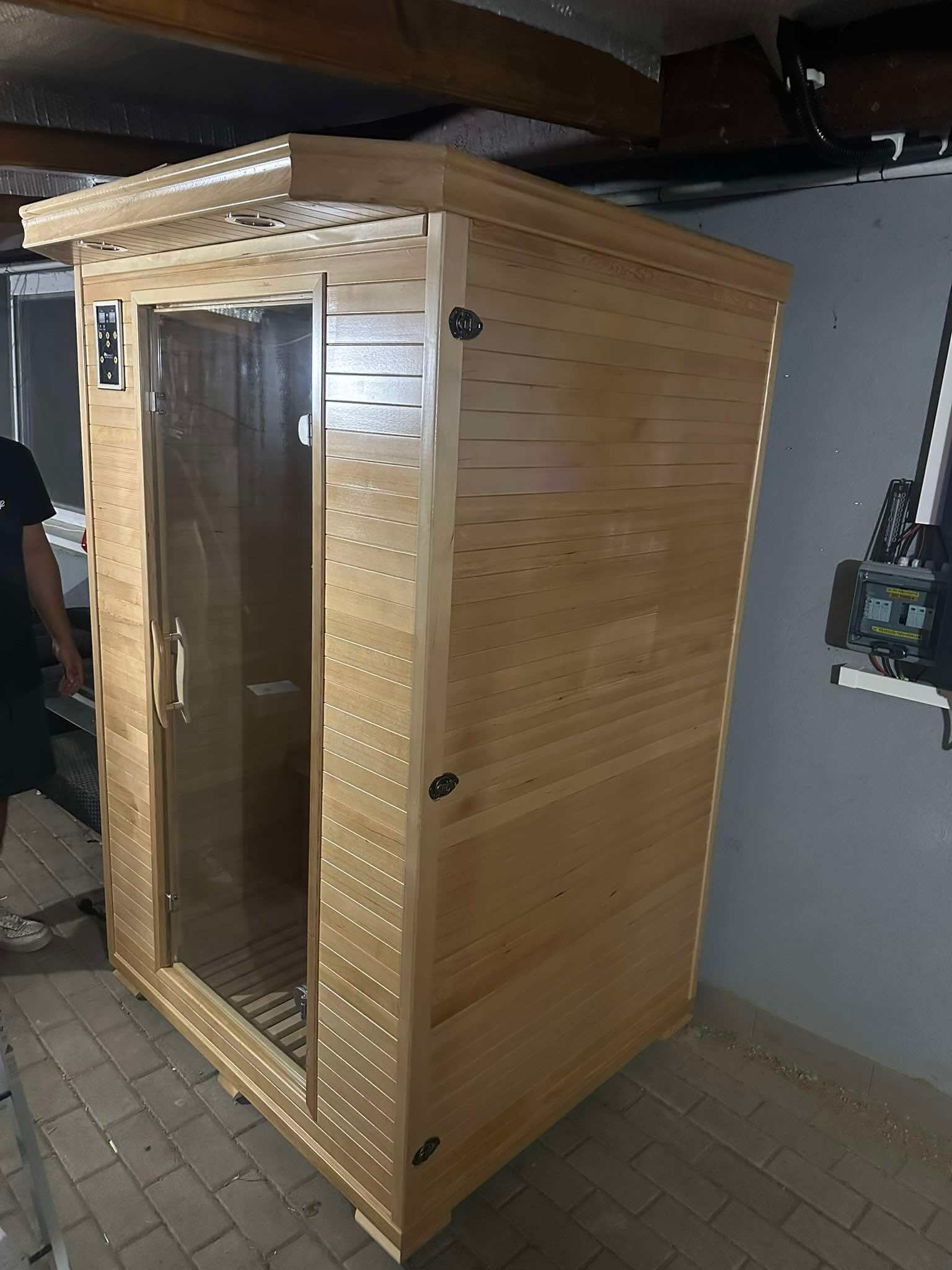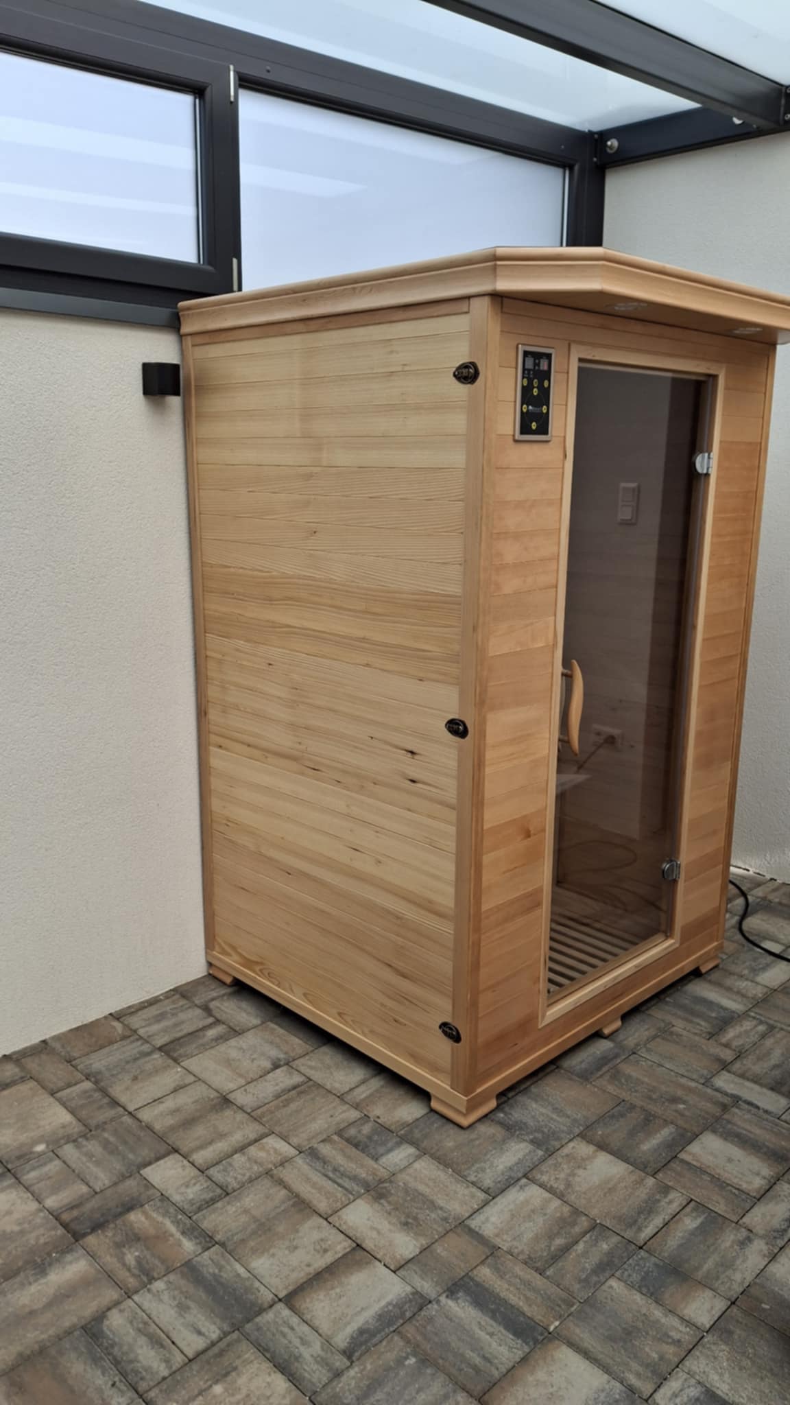 Technikai információ: A 160 cm hosszú kimeneti tápkábel a szauna tetején csatlakozik, ahol a tápegység is van. Onnan lehet elvezetni bármelyik oldalra (amennyiben szükséges).