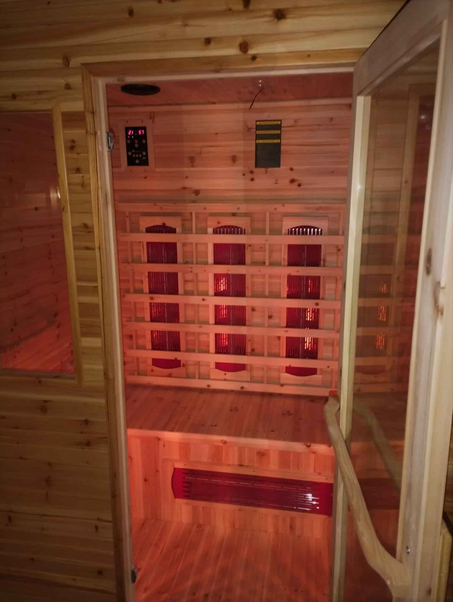 Az infraszauna fakeretes bronz tiszta edzett üvegajtóval rendelkezik (6mm; fa nyitókarral) - letisztult, szép, könnyen nyitható és megfelelően zárható, hőtartó,hőálló, biztonságos - igény szerint a másik oldalra is felszerelhető, mellyel megváltozik a nyitás iránya.